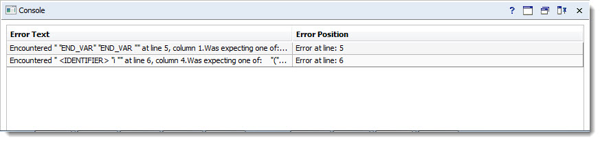 Консоль отображает ошибки выявленные после анализа программы. Анализ выполняется по нажатию кнопки "Analyze" в панели инструментов или после нажатия клавиши "Enter" в текстовом редакторе.