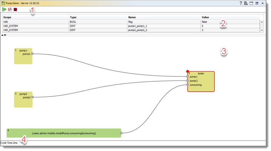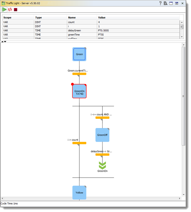 ![]() | Оба вида отладчика (текстовый и графический) предусматривают установку точек остановки по двойному клику на компоненте или на номере строки. После запуска программы ее выполнение продлится до ближайшей точки. После остановки в точке пользователь сможет провести отладку программы шаг за шагом. Удаление точки происходит по двойному клику по ней. |