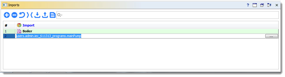 Панель импортов необходима для добавления в программный компонент других программных компонентов, разработанных на языках Process management. Импортированные программные компоненты могут использоваться пользователем в теле редактируемого программного компонента.