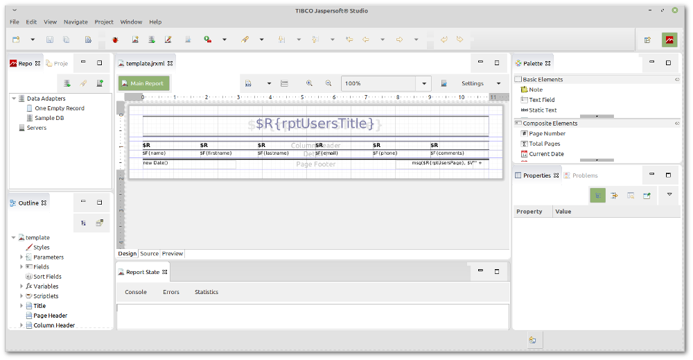 Редактор отчетов - это часть AggreGate Client, используемая для редактирования Шаблонов отчетов. Он используется для изменения формы отчета, изменения его компонентов (заголовка, краткого содержания, верхнего/нижнего колонтитула страницы и деталей), а также редактирования выражений, используемых для подсчета значений данных, отображенных в отчете. Нет необходимости создавать новые шаблоны с нуля, поскольку система генерирует шаблоны по умолчанию на основе просмариваемых данных. В большинстве случаев вам просто нужно провести их тонкую настройку и сделать собственными.
