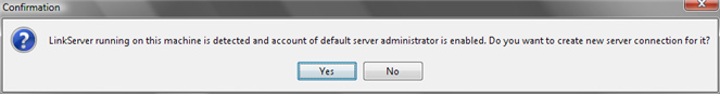 Если при загрузке AggreGate Client не находит настроенных соединений к серверам (т.е. под узлом Серверы нет узлов Сервер), AggreGate Client пытается соединиться с AggreGate Server, запущенным на порту по умолчанию на локальном компьютере. Если соединение установлено успешно, а AggreGate Client может залогиниться на сервер под учетной записью администратор по умолчанию (с логином/паролем по умолчанию), система предложит Вам установить новое автоматическое Подключение к серверу: