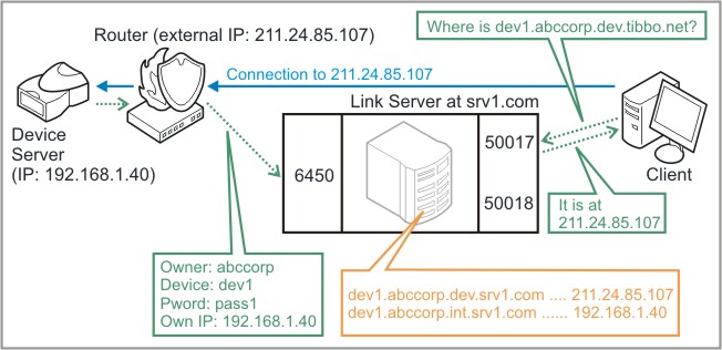 Получившееся в результате хост-имя не отличается от тех имен или URL-адресов, которые Вы уже когда-либо использовали. Введите это имя в любой программе, которая способна подключиться к Вашему Серверу Устройств и это имя будет автоматически преобразовано в текущий IP-адрес этого Сервера Устройств! Этот функция основана на стандартном протоколе DNS и не требует никаких особых драйверов или специального программного обеспечения. Сервера Устройств регистрируются на внешнем сервере DNS таком как BIND в *nix или Windows DNS Server.
