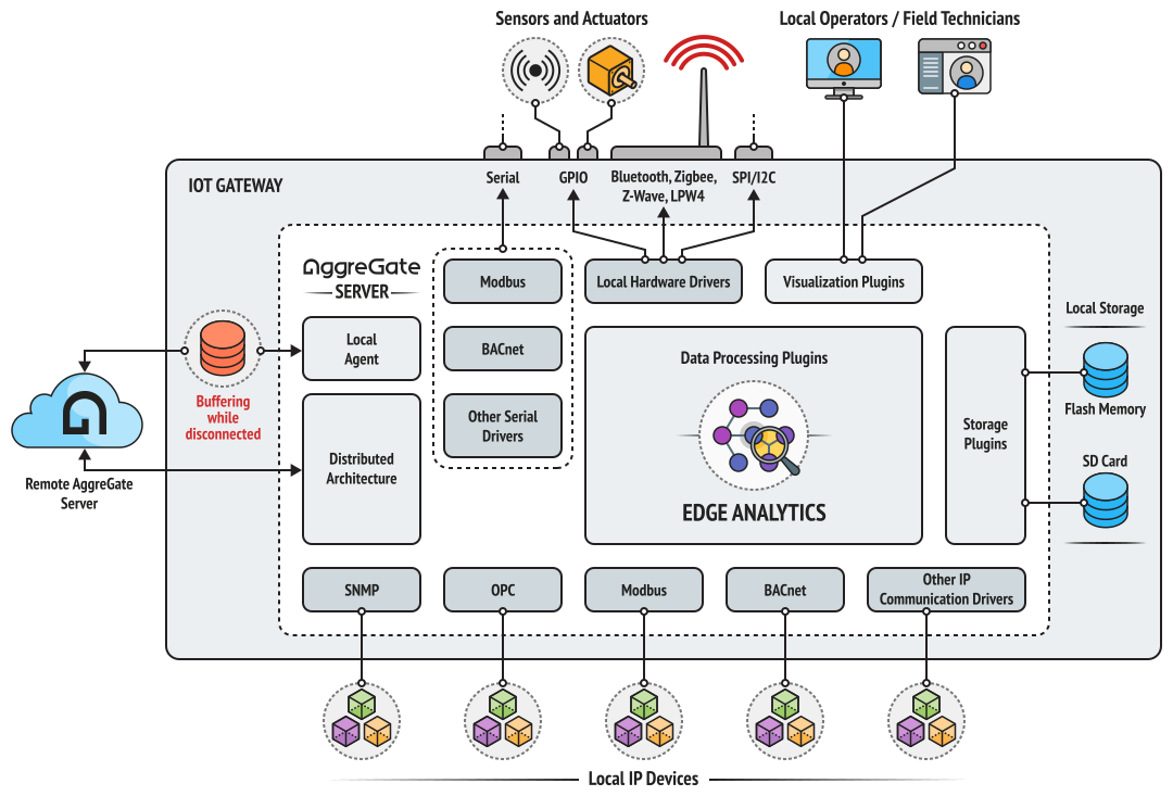 Такой IoT-шлюз может передавать информацию на сервера AggreGate более высокого уровня через так называемый локальный агент, а также может быть объединён с другими серверами через распределенную архитектуру, обеспечивая доставку агрегированных и обработанных данных в облако.