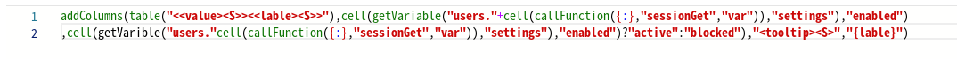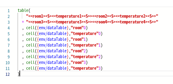 Перечисление аргументов в столбце делает код гораздо более читабельным. Строка, определяющая таблицу, разбивается на две строки с помощью оператора конкатенации "+", а последующие аргументы записываются в отдельной строке:
