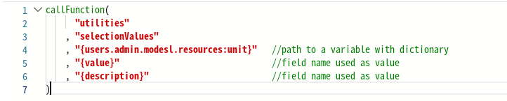 В выражении записывается специальная функция, указывающая путь к каталогу и имена полей, которые будут использоваться в качестве имени и описания выбранного поля переменной: