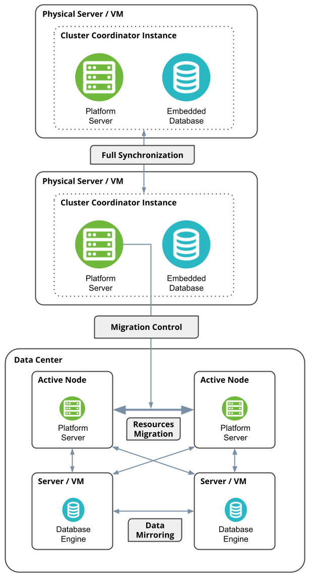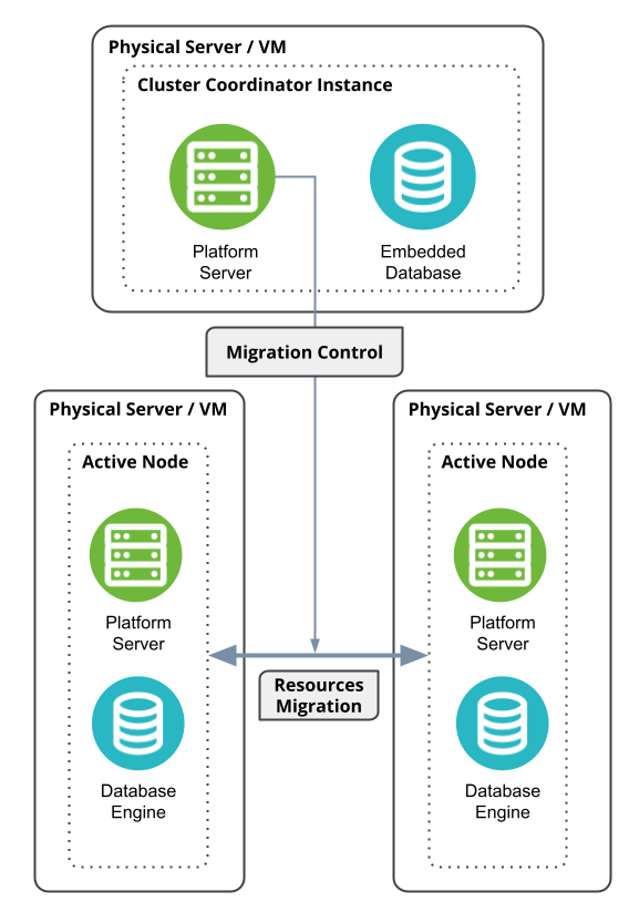 Архитектура активно-активного отказоустойчивого кластера строится либо из двух узлов Active-Passive Failover Cluster, либо из четырех узлов High-load Active-Passive Failover Cluster, в зависимости от ожидаемой нагрузки на систему. Один или два сервера/ВМ Cluster Coordinator добавляются к описанным выше структурам узлов, формируя следующий список вариантов: