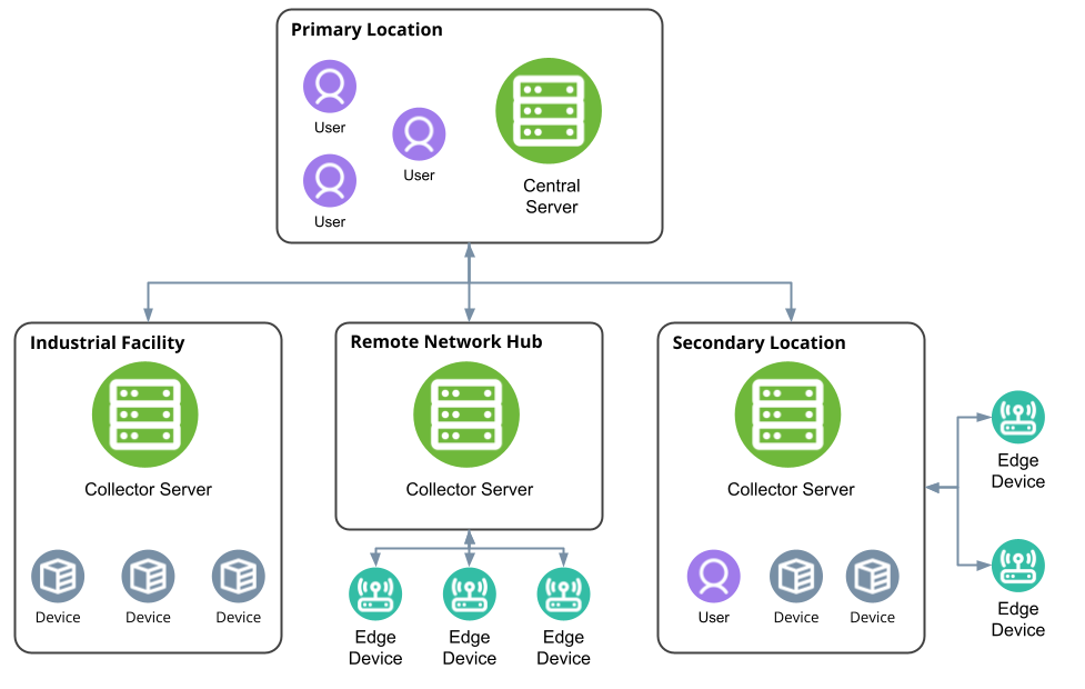 В этом двухуровневом сценарии центральный сервер обычно устанавливается в основном центре обработки данных компании, а серверы коллекторов/зондов располагаются рядом с устройствами, которые они контролируют или обслуживают.