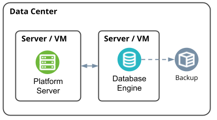 Эта схема развертывания требует наличия двух серверов/VM - одного для экземпляра сервера AggreGate и другого для экземпляра движка базы данных. Обе машины должны быть расположены в одном центре обработки данных и соединены высокоскоростной сетью (1 Гбит/с или выше) из-за высокой интенсивности обмена данными между сервером AggreGate и его базой данных.