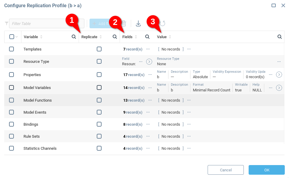 Непосредственно перед началом операции пользователь должен выбрать переменные, которые будут скопированы, выделив их в поле Реплицировать (1). Также можно выбрать, какие поля будут скопированы (2). Наконец, можно указать новое значение для любой переменной (3):