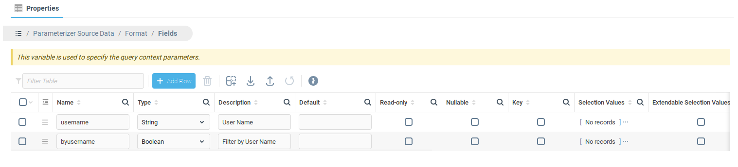 Формат является форматом Таблицы данных, которая создается и отображается в режиме редактирования, чтобы пользователь мог изменять поля. Значения этих полей будут конвертированы в строки и вставлены в Выражение для параметризации. Таблица данных, построенная из Формата, всегда содержит только одну запись. Данная таблица позволяет пользователю интерактивно задаввать значения параметров, которые будут в дальнейшем использованы в Выражении для параметризации.