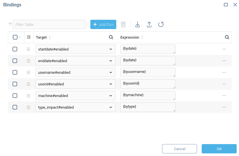 ENABLING_CONDITION_EXPRESSION является выражением AggreGate, которое может содержать ссылки на ячейки Таблиц данных, построенных из PARAMETERS_FORMAT. Форматом ссылок является{FIELD_NAME}, где FIELD_NAME - имя поля, определенного через PARAMETERS_FORMAT. Более подробную информацию о ссылках см. здесь.