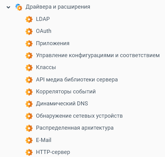 Для администрирования плагинов используются два контекста: общий контекст Конфигурация драйверов/плагинов, который служит в качестве контейнера, и контекст Конфигурация драйвера/плагина, который содержит конфигурацию только одного плагина.