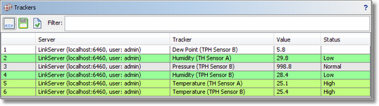 Датчики помогают отслеживать данные сервера для решения критически важных задач в реальном времени. Все датчики сведены в единую таблицу (например, окно Датчики в AggreGate Client)с целью обеспечения эффективного мониторинга. Для обозначения состояния датчика используется цветовое выделение.