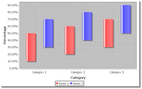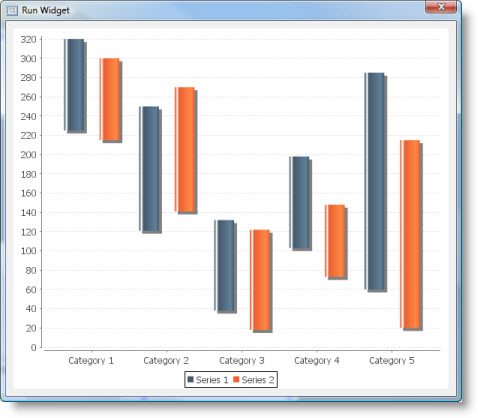 Столбчатая диаграмма, которая отображает интервалы (т.е. начальное значение и конечное значение) для каждой пары серии/категории в массиве данных. |
