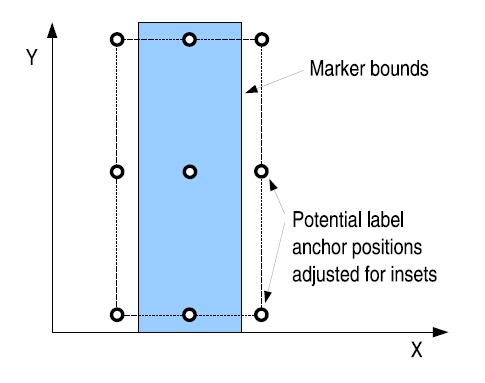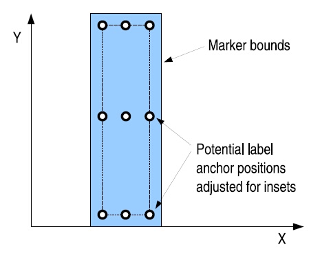 Рисунок ниже иллюстрирует, как рассчитывается позиция точки привязки метки маркера относительно его границ. Одна из девяти потенциальных точек привязки выбирается через свойство Точка привязки метки, а расстояние между границами маркера и потеницальными точками привязки определяется методами Смещение метки и Тип смещения метки.