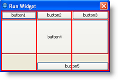 При увеличении окна виджета, как показано на следующем рисунке, вы увидите, что кнопка строки, которая содержит Кнопку 5, увеличивается вертикально. Горизонтальное расстояние распределяется поровну между всеми столбцами. Изменение размера основано на весе, заданном для индивидуальных компонентов в макете панели. Также вы заметите, что каждый компонент занимает все доступное место по горизонтали, но не все (как, например, кнопка 5) доступное место по вертикали. Данное поведение также определяется весом компонента.