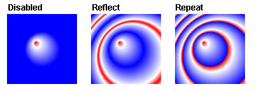 Другое изображение представляет каждый из трех цикличных методов, применимых к радиальному градиенту, с теми же параметрами, но с не центрированным фокусом (Focus X, Focus Y: 40.0):
