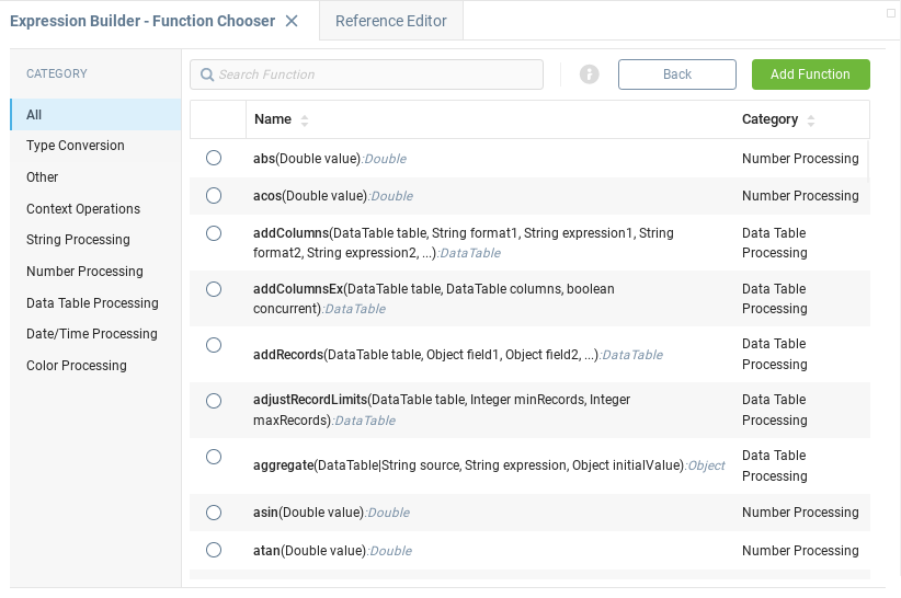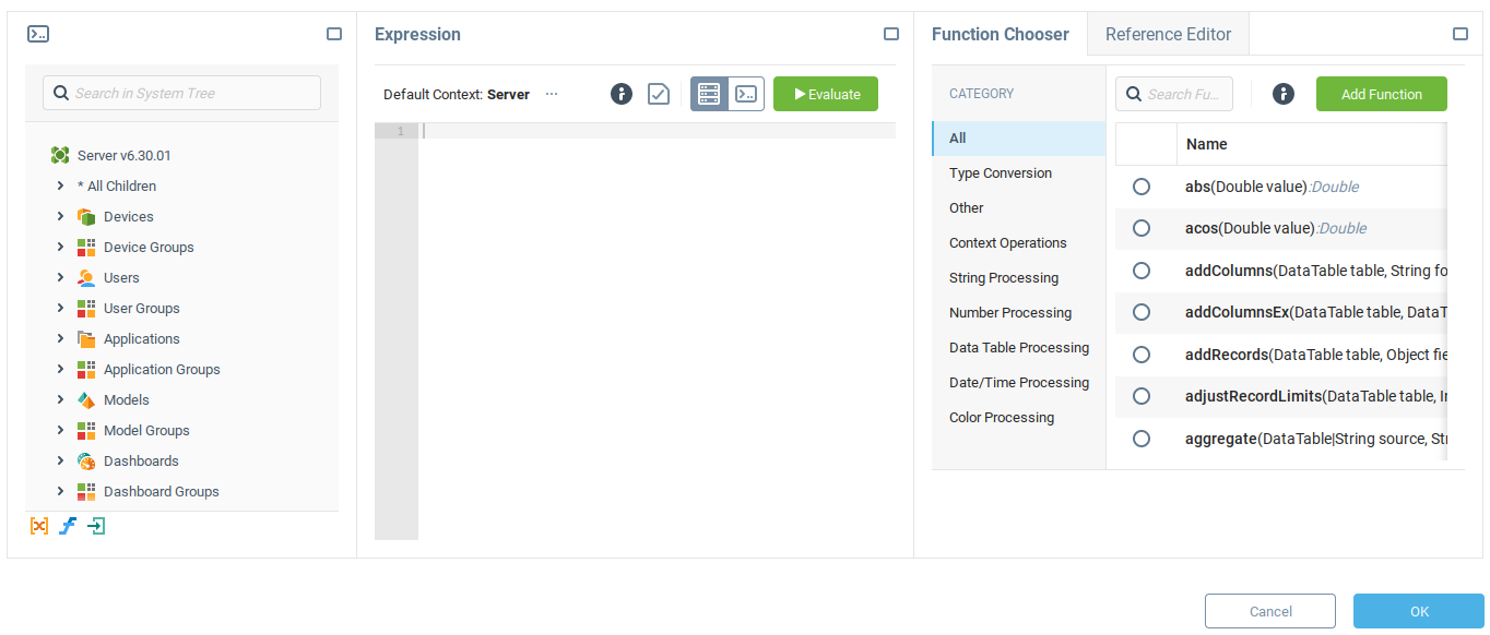 Конструктор выражений - это среда разработки для работы с языком выражений. Этот компонент открывается при редактировании полей Выражение в редакторе свойств и содержит инструменты для эффективного тестирования и создания выражений в AggreGate.