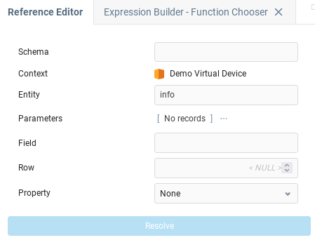 • Селектор сущностей в левой панели позволяет ссылаться на контекстыAggreGate Server, переменные, функции, события и даже на определенные поля и строки из их форматов таблиц данных. При наведении курсора на элемент в дереве появляются кнопки для копирования или прямой вставки абсолютной ссылки на сущность.