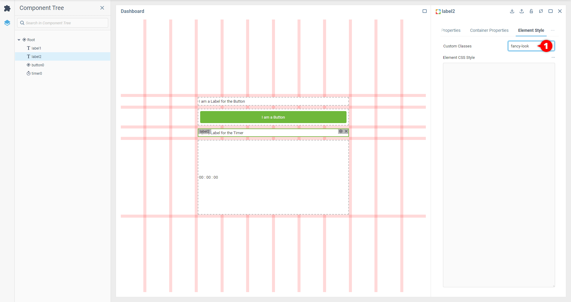 1. В Конструкторе UI для каждого компонента, к которому вы хотите применить общий стиль, добавьте выбранный класс в свойство Пользовательские классы, как это было описано в примере Добавление новых классов. В нашем сценарии давайте добавим класс fancy-look для компонентов с именами Label2 и Timer0.