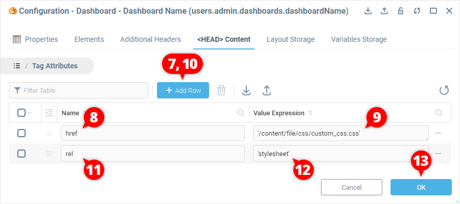 Чтобы использовать пользовательский CSS-файл, загруженный в медиатеку, в инструментальной панели , добавьте его в качестве дополнительного заголовка <head> инструментальной панели, используя адрес, основанный на местоположении файла в таблице Список файлов: