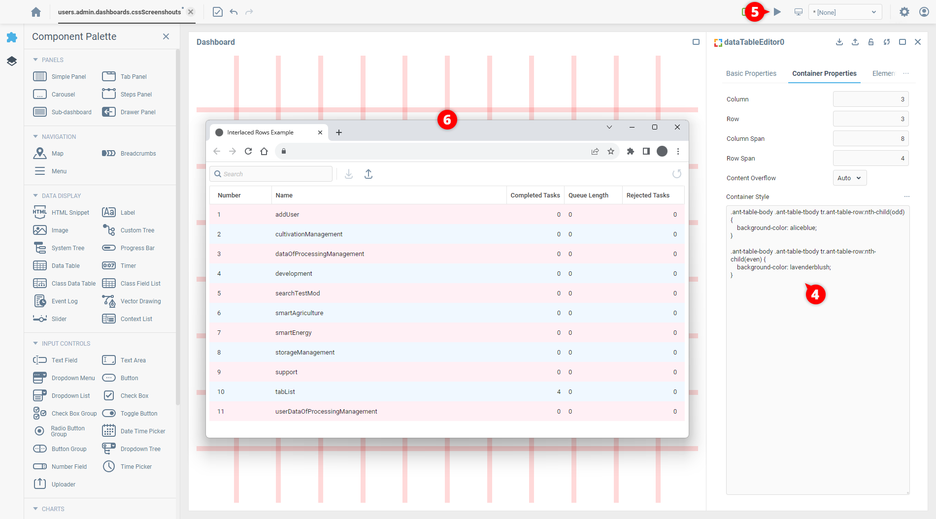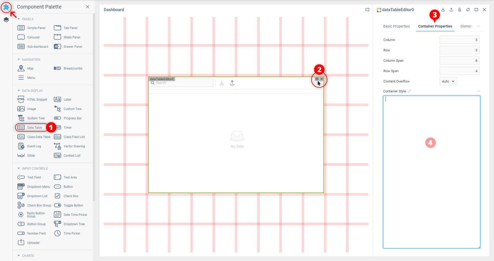 1. В Конструкторе Инструментальных Панелей добавьте компонент Таблица с данными на инструментальную панель, кликнув по нему в палитре компонентов или перетащив его на макет.