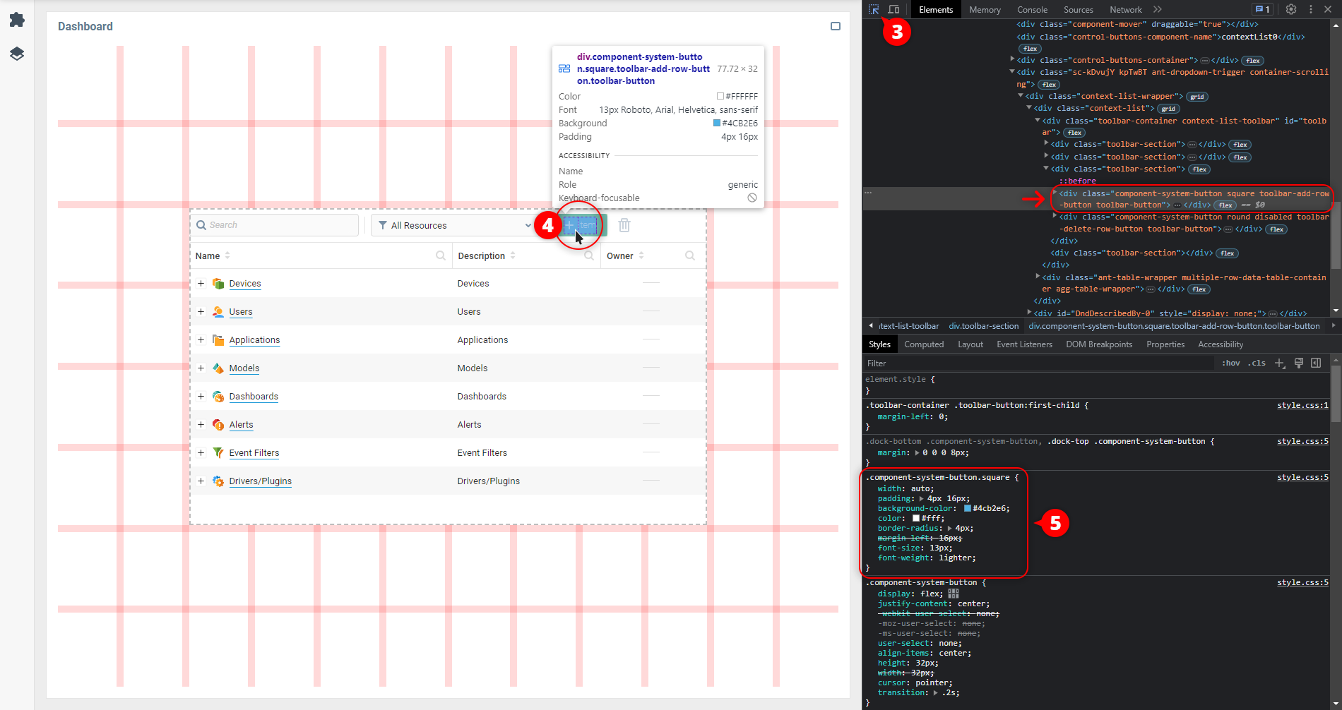 3. Изучите свойства Стиль элемента, выделенного в дереве документа. Это элемент <div> с атрибутом class="component-system-button square toolbar-add-row-button toolbar-button". Похоже, что это действительно правильный элемент, к которому нужно применить стили.