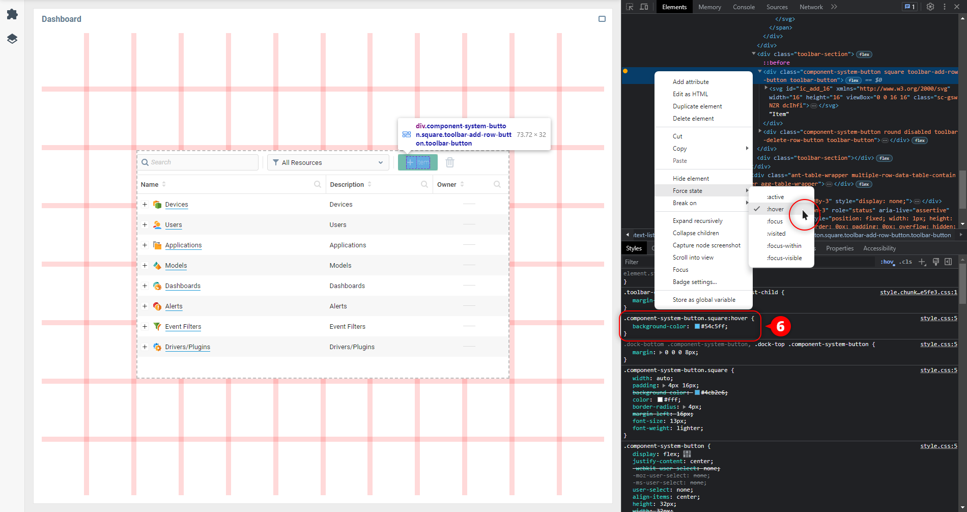 1. Чтобы узнать, что отвечает за стиль элемента в наведенном состоянии, принудительно включите это состояние, открыв контекстное меню правым щелчком на элементе в дереве документа и выбрав состояние :hover из группы Установить состояние (или аналогичной).