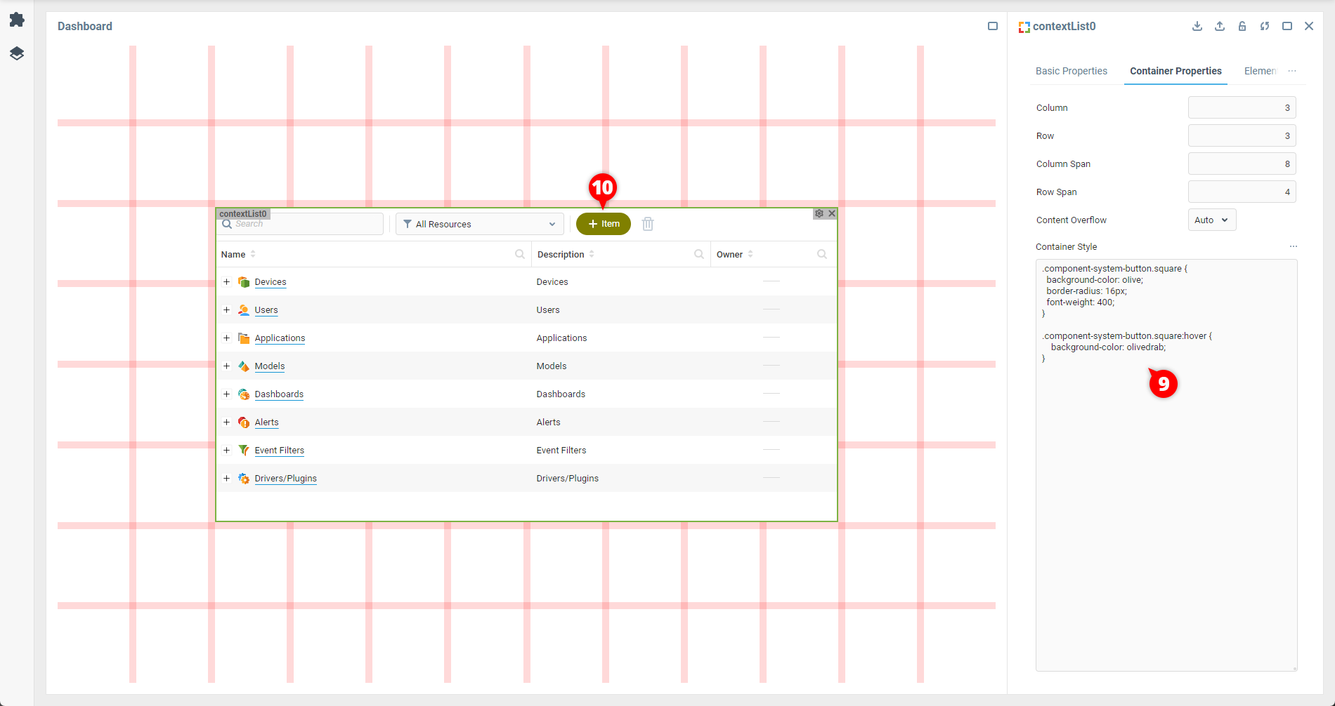 1. На вкладке Свойства контейнера добавьте правило CSS с ранее замеченным селектором к свойству Стиль контейнера: