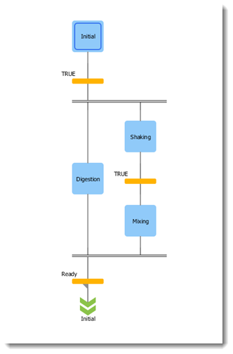 Теоретически, параллельные ветви выполняются одновременно. В жизни это означает в одном рабочем цикле, слева направо. Условие перехода, завершающее параллельность, проверяется только в случае, если в каждой параллельной ветви активны последние шаги. В данном примере Shaking будет выполнен однократно, далее Digestion и Mixing будут работать параллельно до выполнения условия Ready.