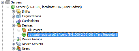 - Новое устройство пытается подключиться, заявляя, что оно управляется пользователем "admin" (например). Оно также говорит AggreGate, что это – устройство учета рабочего времени.