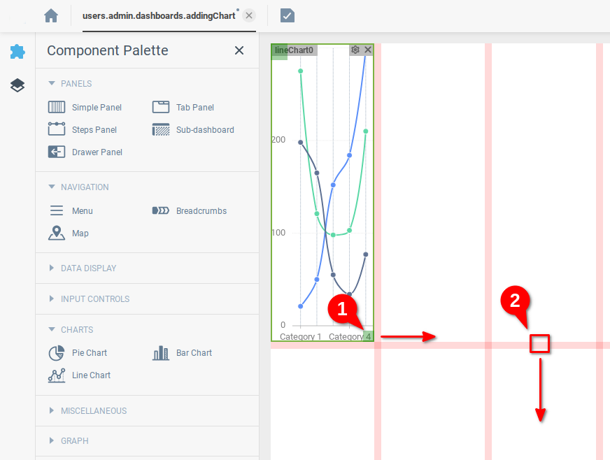 Перетащите правый нижний угол компонента (1), чтобы изменить количество занимаемых ячеек сетки, и перетащите горизонтальную линию сетки (2), чтобы изменить масштаб линий сетки по своему усмотрению.
