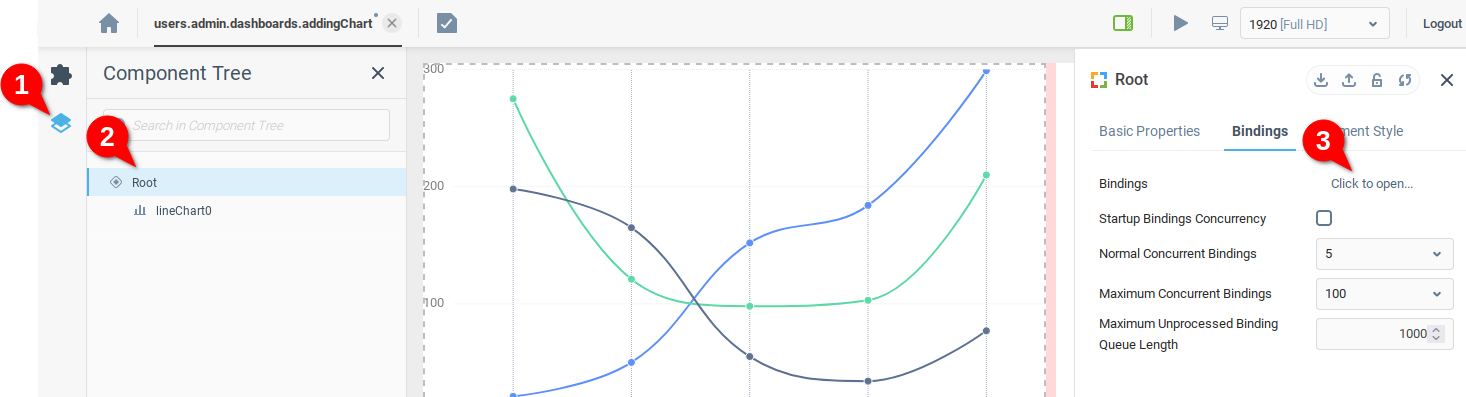 Откроем вкладку Дерево компонентов (1), откроем свойства корневой панели (2) и, наконец, откроем таблицу Привязки (3).