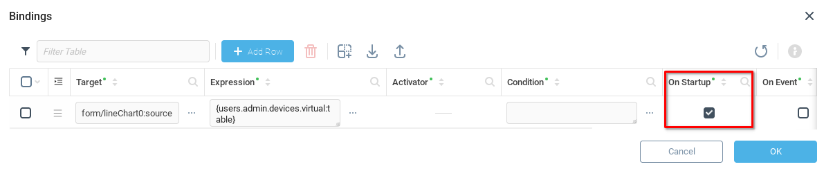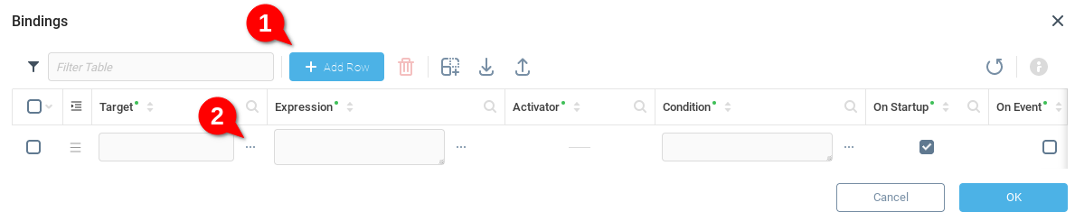 В таблице Привязки мы создадим правило, которое позволит диаграмме получить доступ к данным в нашем виртуальном устройстве. Добавим Строку (1), а затем откроем поле Цель (2) для выбора назначения наших данных.