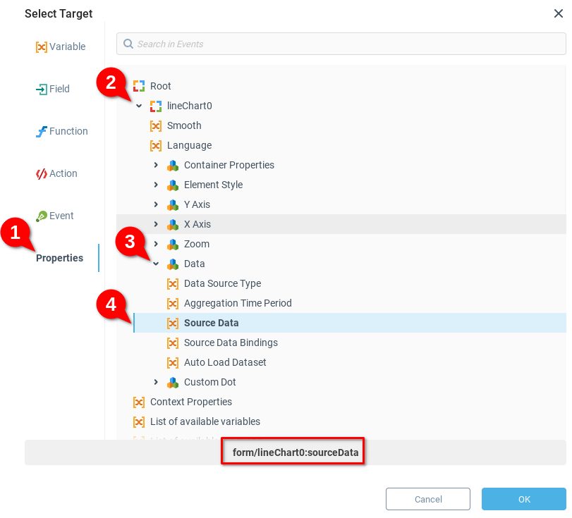 В диалоге Выберите цель мы выбираем Свойства (1), расширяем узел LineChart0 (2), расширяем узел Данные (3) и, наконец, выбираем Исходные данные (4). Обратите внимание, что внизу отображается точный путь контекста. Нажимаем OK для сохранения.