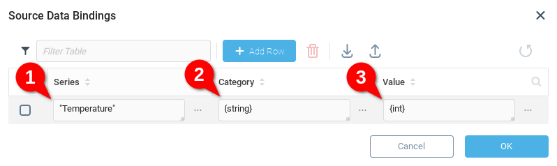 Существует несколько методов отображения данных на линейном графике. На вкладке Данные (1) нашей линейной диаграммы мы выбираем Исходные данные для Типа источника данных (2). Текущие данные будут извлекаться из переменной Исходные данные (3) диаграммы. Мы видим, что пример данных отображается, когда для параметра Тип источника данных выбрано значение Исходные данные.