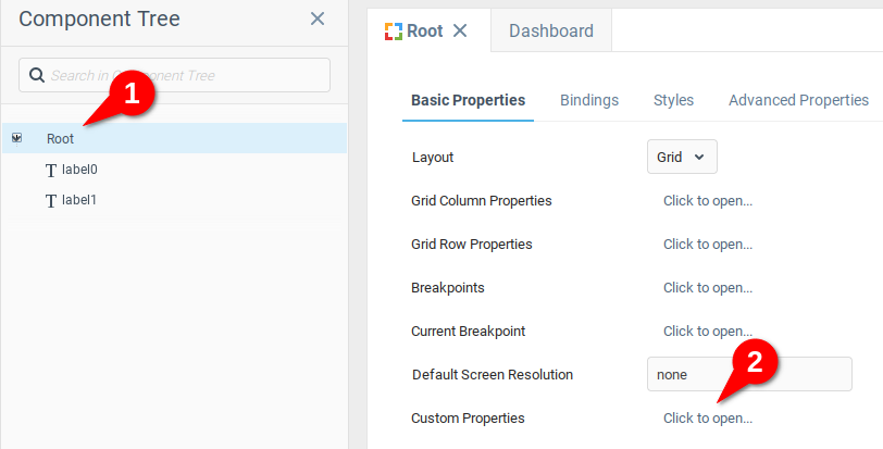 (1) Перейдите к корню дерева компонентов и (2) откройте переменную Дополнительные свойства