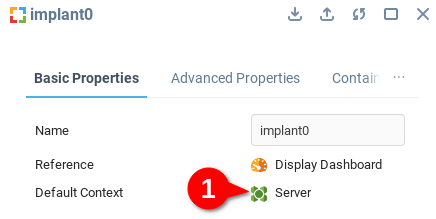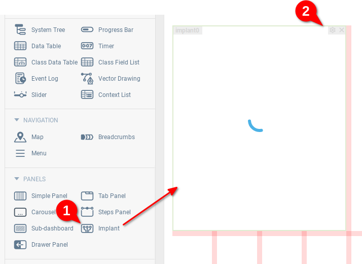 Добавьте контейнер Имплант в рабочую область (1) и откройте редактор его свойств (2).