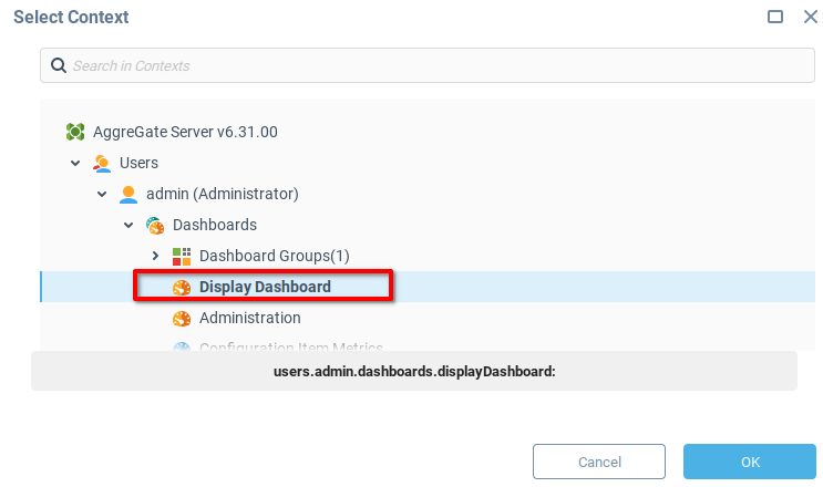 В меню Выбрать Контекст выберите ранее созданную панель Display Dashboard и нажмите OK, чтобы сохранить и закрыть.