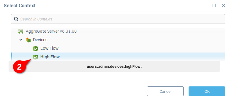 Теперь, когда пользовательская переменная DC настроена, следующим шагом будет изменение выражений привязки. Текущие выражения привязки {users.admin.devices.highFlow:info$description} и {users.admin.devices.highFlow:random$value} ссылаются на конкретное устройство, в данном случае на устройство HighFlow. Чтобы использовать контекст, вставленный из контейнера Имплант, ссылку необходимо обобщить.