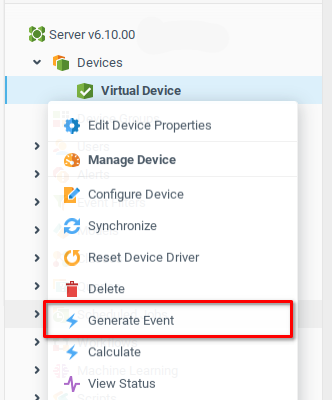 Наше виртуальное устройство может генерировать произвольные события, которые мы будем отображать на Инструментальной панели. Мы сгенерируем несколько событий, открыв контекстное меню устройства из Системного дерева и выбрав опцию Сгенерировать событие.