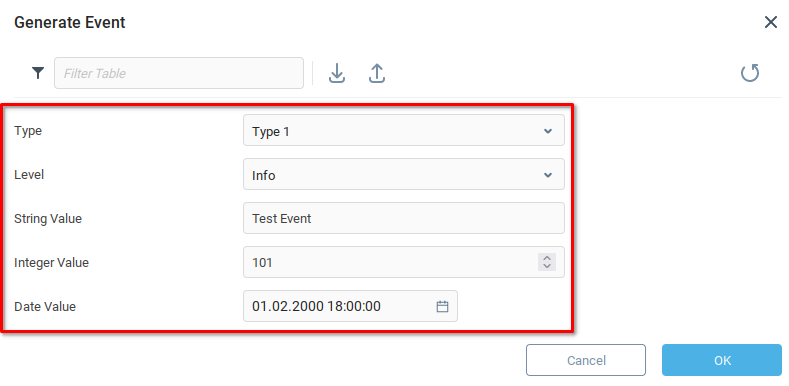 В диалоге Сгенерировать событие мы выбираем значения для ряда параметров и нажимаем кнопку OK. Мы повторяем этот процесс несколько раз, чтобы сгенерировать несколько событий.