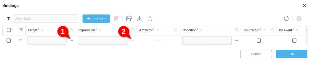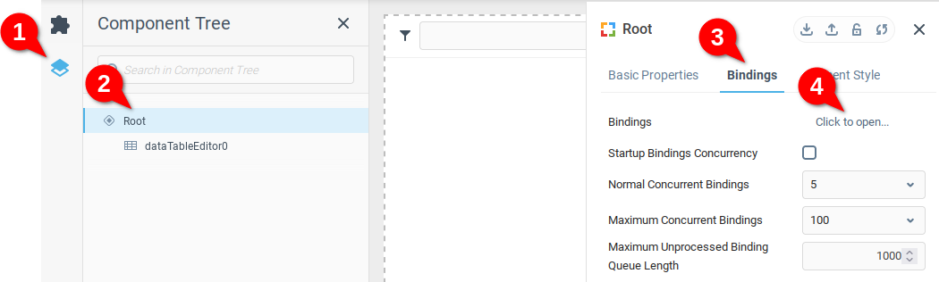 Создав дополнительное виртуальное устройство и добавив компонент Data Table, нам нужно заполнить его соответствующими данными о событиях. Для этого мы создадим одну или несколько привязок данных. Перейдите к Дереву компонентов (1) и выберите корневой компонент (2), чтобы открыть Конфигурацию корневого компонента. Откройте вкладку Привязки (3) и откройте таблицу данных Привязки (4).