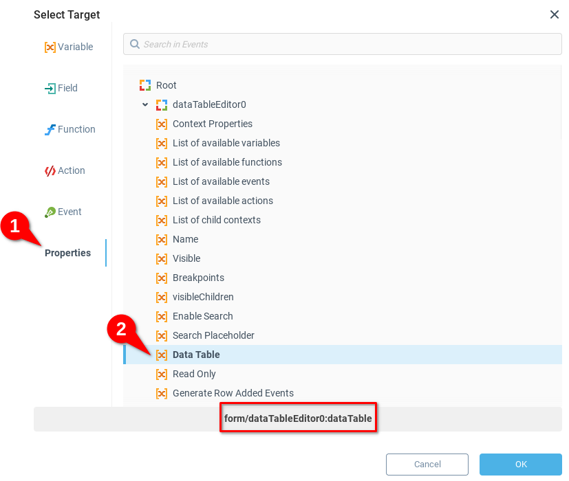 В данном случае цель проста: мы хотим отправить сведенья в компонент Data Table нашей Инструментальной панели. В меню Выбрать цель мы выбираем вкладку Свойства (1), открываем компонент Data Table и выбираем переменную Таблица с данными (2). Текущая переменная содержит данные для нашего компонента. Обратите внимание, что текстовый путь к этому конкретному свойству отображается в нижней части окна. Сохраняем и закрываем окно, нажав OK.