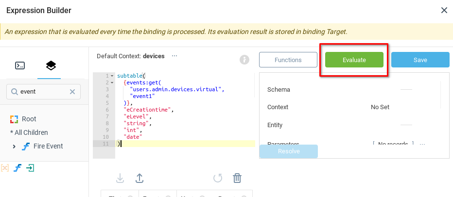 subtable( {events:get( "users.admin.devices.virtual", "event1" )}, "eCreationtime", "eLeve![]() | Обратите внимание, что параметры функции заключены в двойные кавычки, поскольку это простые текстовые строки, а не вложенные выражения. Подробности см. в разделе Функции в Ссылках. |