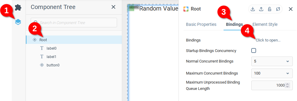 Чтобы создать привязки, которые будут использоваться в нашей приборной панели, откроем дерево компонентов (1), выберем компонент Корневая панель(2), откроем вкладку Привязки (3) и, наконец, откроем таблицу Привязки (4).
