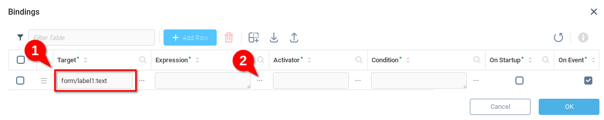 Мы видим, что контекстный путь к целевой переменной - form/label1:text (1), а затем открываем редактор выражений (2).
