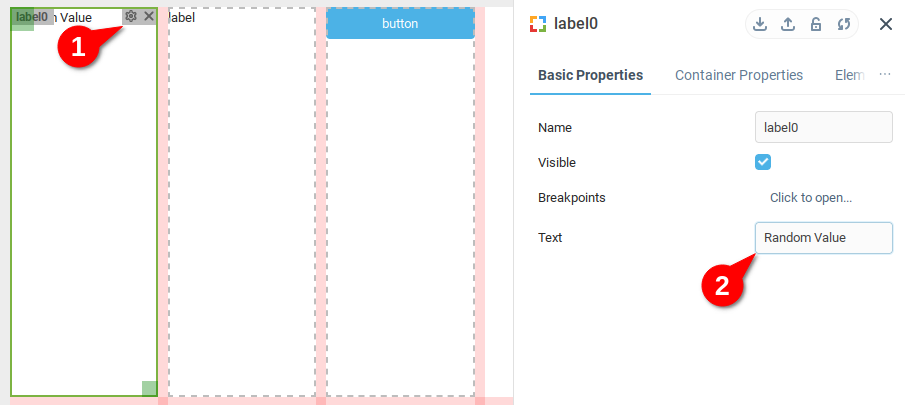 Щелкните на значке свойств label0 (1) и измените ее свойство Текст(2) в окне свойств на Random Value: