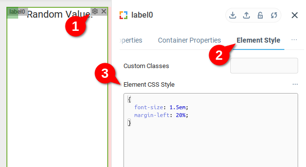Откройте окно свойств для lable0 и перейдите в раздел Стиль элемента. Мы добавим несколько простых CSS в Стиль CSS элемента , чтобы увеличить размер шрифта и немного сместить поля: